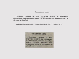 Повышенная плата Губернская гимназия въ виду отсутствия средствъ на содержание параллельных классовъ съ следующего 1917-18 учебнаго года повышаетъ плату за обучение до 80 рублей. Источник : Повышенная плата // Старый Владимирец. – 1917. – 1 марта. – С. 2.