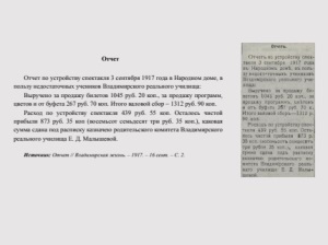 Отчет Отчет по устройству спектакля 3 сентября 1917 года в Народном доме, в пользу недостаточных учеников Владимирского реального училища: Выручено за продажу билетов 1045 руб. 20 коп., за продажу программ, цветов и от буфета 267 руб. 70 коп. Итого валовой сбор – 1312 руб. 90 коп. Расход по устройству спектакля 439 руб. 55 коп. Осталось чистой прибыли 873 руб. 35 коп (восемьсот семьдесят три руб. 35 коп.), каковая сумма сдана под расписку казначею родительского комитета Владимирского реального училища Е. Д. Малышевой. Источник: Отчет // Владимирская жизнь. – 1917. – 16 сент. – С. 2.