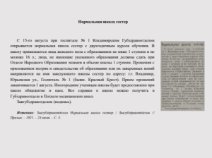 Нормальная школа сестер С 15-го августа при госпитале № 1 Владимирским Губздравоотделом открывается нормальная школа сестер с двухгодичным курсов обучения. В школу принимаются лица женского пола с образованием не ниже 1 ступени и не моложе 16 л.; лица, не имеющие указанного образования должны сдать при Отделе Народного Образования экзамен в объеме школы1 ступени. Прошения с приложением метрик и свидетельства об образовании или их заверенных копий направляется на имя заведующего школы сестер по адресу: г.г. Владимир, Юрьевская ул., Госпиталь № 1 (бывш. Красный Крест). Прием прошений заканчивается 1 августа. Иногородним ученицам школы будет предоставлено при школе общежитие и паек. Все справки о школе можно получить в Губздравоотделе в Потделе медицинских школ. Завгубздравотделом (подпись). Источник: Завгубздравотделом Нормальная школа сестер / Завгубздравотделом // Призыв. –1921. –24июня. –С. 3.