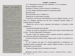 Умирай - не помогут В г. г. Владимире я пока знаю две лечебницы - 1-го и 2-го района И затем «Первую» помощь. Нуждаясь в лечении, я пошел сначала в 2-ой район, но.. «С 30-го ноября лечебница закрыта за неимением дров». Проходит день. На следующий я иду в 1-й район, но... «Приема нет за недостатком топлива». Я чувствую, что болезнь моя развивается и иду в Первую помощь, но (это было 2-го декабря), просидев там два часа и встретив, наконец, врача, и с великой радостью говорю: - Видите-ли, так-то и так-то, напишите мне рецепт, а то болезнь у меня развивается... С ядовитой усмешкой мне отвечают. - Я врач, но только не дежурный, я только здесь живу и писать рецепт вам не буду, - частной, практикой не занимаюсь... Я ухожу и через час прихожу снова в надежде встретить дежурного, но, увы, сижу еще два часа и не дожидаюсь. Сегодня я никуда не пойду и буду умирать дома, потому что помощи нет и не будет. Тут нет топлива, там дров, тут частной практикой по занимаются, тут дежурный прошел понарошку мимо здания «Первая помощь», там еще чтонибудь будет и так без конца. Неужели Губздрав отдел не подтянет кого надо?.. Источник: Дмитрий Рабочий. Умирай не помогут / Дмитрий Рабочий // Призыв. – 1921. – 6 дек. – С. 2.
