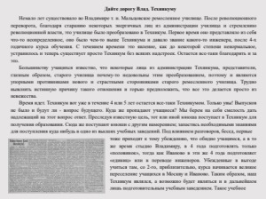 Техникуме. Принимая в расчет это обстоятельство, мы в праве сказать, что это в высшей степени ценно и необходимо именно для Практ. Института и во-вторых, явится преимуществом перед другими учебными заведениями, в случае перехода на самоснабжение, в смысле хорошего источника материальных средств. Для чего стоит только увеличить производительность мастерских, путем расширения программы пракработ. Говоря дальше об источниках средств - необходимо ожидать и нельзя отвергнуть взимание посильной платы с самих учащихся и, чтобы извлечь из этого настоящую пользу, необходимо прибегнуть к принципу: Максимум учащихся - минимум учащих, проще и технически выражаясь - довести нагрузку до предела. Третьим источником поддержки пока фиктивного Практ. Института - это наши городские центры во главе с Губисполкомом, куда главным образом и обратились взгляда всех учащихся. Они знают и считают, что этот вопрос, по своему существу, подлежит рассмотрению в Губпрофобре, и жалеют, что Губпрофобр в этом направлении почти ничего или, по большей мере, проявляет энергии весьма мало. Поэтому в Губисполкоме они видят «палочку выручалочку». Стоит только ухватиться за него, передать ему свои мысли, как вопрос будет решен и средства найдутся. Преобразуя Техникум в Практ. Институт, нам, само собой разумеется, понадобится профессорский состав. Изыскав тем или иным путем средства, нам не придется особенно тужить о подыскании профессоров, ибо часть их мы имеем теперь, хотя бы в лице Председателя Президиума нынешнего Техникума. Кроме него, часть безусловно можно найти во Владимире и остальных пригласить из так называемых «сокращенных». Не пугает так-же и отсутствие в Техникуме физического кабинета. На помощь в этом отношении придет намИ. Н. О. ишкола 2-й ступени (быв. Реальное училище), где имеется хороший физический кабинет. Таким образом мы пришли к выводу: единственный тормоз это средства к существованию, но ведь и другие учебные заведения не в лучших, а в худших условиях и все-таки идут вперед. Рассуждая таким образом, мы, учащиеся, не претендуем на безукоризненную правку своих взглядов и вывода, однако считаем, что они не лишены последовательности. Убежденные в том, что наша администрация (исключая Председателя Президиума и Совета) займет отрицательную позицию на предстоящем, в ближайшем будущем, профессионально-техническом съезде и принимая в соображениe это обстоятельство, мы просим Губкомпарт, Губисполком, Губпрофобр, Губотнароб,