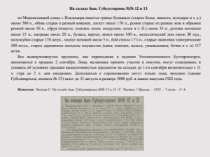 На складе быв. Губкустпрома №№ 12 и 13 по Мироносицкой улице г. Владимира имеется тряпье бумажное (старое белье, шинели, мундиры и т. д.) около 500 п., обувь старая и разный кожевен, лоскут около 170 п., ремни старые из разных кож и обрывки ремней около 50 п., сбруя (хомуты, седелки, шлеи, недоуздки, седла и т. П.) около 35 п., рогожи негодные около 15 п., матрацы около 20 п., бумага, картон, книги около 100 п., металлический лом около З0 пуд., полушубки старые 170 штук., лоскут меховой около 5 п., бой стекла 17½ п., старые лампочки электрические 500 штук., старое деревянное негодное имущество (сани, повозки, колеса, умывальники, бочки и т. п) 117 штук. Все вышеупомянутые предметы, как перешедшие в ведение Уполномоченного Кустпромторга, назначаются к продаже 2 сентября. Лица, желающие принять участие в покупке, могут осматривать и узнавать об условиях продажи вышеупомянутых предметов на складах до 1-го сентября включительно с 11 ч. утра до 2 ч. дня ежедневно. Допускаться к соревнованию могут только лица, внесшие (здание Губсовнархоза, комната № 33) залог до 31 августа в размере 5000 руб. в знаках выпуска 1922 года. Источник: Чистов С. На складе быв. Губкустпрома №№ 12 и 13 / С. Чистов // Призыв. – 1922. – 7 сент. – С. 6.