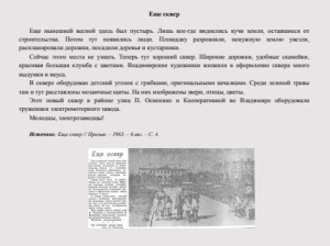 Еще сквер Еще нынешней весной здесь был пустырь. Лишь кое-где виднелись кучи земли, оставшиеся от строительства. Потом тут появились люди. Площадку разровняли, ненужную землю увезли, распланировали дорожки, посадили деревья и кустарники. Сейчас этого места не узнать. Теперь тут хороший сквер. Широкие дорожки, удобные скамейки, красивая большая клумба с цветами. Владимирские художники вложили в оформление сквера много выдумки и вкуса. В сквере оборудован детский уголок с грибками, оригинальными качалками. Среди зеленой травы там и тут расставлены мозаичные щиты. На них изображены звери, птицы, цветы. Этот новый сквер в районе улиц П. Осипенко и Кооперативной во Владимире оборудовали труженики электромоторного завода. Молодцы, электрозаводцы! Источник: Еще сквер // Призыв. –1963. –6авг. –С. 4.
