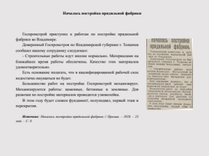 Началась постройка прядильной фабрики Госпромстрой приступил к работам по постройке прядильной фабрики во Владимире. Доверенный Госпромстроя по Владимирской губернии т. Толкачев сообщил нашему сотруднику следующее: - Строительные работы идут вполне нормально. Материалами на ближайшее время работы обеспечены. Качество этих материалов удовлетворительно. Есть основание полагать, что в квалифицированной рабочей силе недостатка ощущаться не будет. Большинство работ на постройке Госпромстрой механизирует. Механизируются работы: каменные, бетонные и земляные. Для развозки по постройке материалов проводится узкоколейка. В этом году будет сложен фундаменТ, полуподвал, первый этаж и перекрытия. Источник: Началась постройка прядильной фабрики // Призыв. – 1928. – 23 мая. – С. 8.
