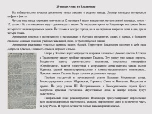 На избирательном участке архитектор читал лекцию о родном городе. Лектор приводил интересные цифры и факты. Четыре года назад горожане получили за 12 месяцев 9 тысяч квадратных метров жилой площади, потом - 12, затем - 16, а в минувшем году - девятнадцать тысяч. За последнее время во Владимире выстроено более четырехсот индивидуальных домов. Не только в центре города, но и на окраинах выросли дома в два, три и четыре этажа. Архитектор говорил о построенном и рассказывал о будущих проспектах, садах и парках, о большом стадионе, о новых зданиях учебных заведений, кино, о троллейбусной линии. Архитектор раскрывал чудесные картины наших будней. Территория Владимира включит в себя села Доброе и Красное, Нижнее Сельцо и Верхнее Сельцо. 29 новых улиц во Владимире Скоро у Золотых ворот образуется широкая площадь с Домом Советов. Отсюда к Тракторному заводу пройдет проспект Сталина. Эту улицу уже начали строить. Воздвигнут корпус строительного техникума, построена типография «Стройиздата», ведется подготовка к сооружению дома-квартала завода имени Жданова, зданий машиностроительного и химико-механического техникумов... Проспект имени Сталина будет лучшим украшением города. Пройдет год-другой и неузнаваемой станет Большая Московская улица. Реконструируются улицы Муромская, Горького, Сакко и Ванцетти, Некрасова и другие. На углу улицы III Интернационала и Коммунального спуска будет построена красивая гостиница. Двухэтажные дома в центре города будут надстроены. Генеральный план реконструкции Владимира предусматривает перенесение всех железнодорожных мастерских, складов, паровозного депо в восточную часть за реку Рпень. В городе останется только пассажирский вокзал.