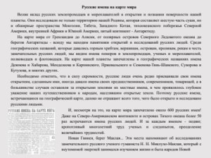 Русские имена на карте мира Велик вклад русских землепроходцев и мореплавателей в открытии и познании поверхности нашей планеты. Они исследовали не только территорию нашей Родины, которая составляет шестую часть суши, но и обширные пространства Монголии, Тибета, Западного Китая, тихоокеанского побережья Северной Америки, внутренней Африки и Южной Америки, пятый континент - Антарктиду. На карте мира от Гренландии до Аляски, от полярных островов Северного Ледовитого океана до берегов Антарктиды - всюду мы находим памятники открытий и исследований русских людей. Среди географических названий, которые давались горным хребтам, вершинам, островам, проливам, рекам в честь замечательных русских людей, мы видим имена поморов и землепроходцев, ученых и мореплавателей, полководцев и флотоводцев. На карте нашей планеты запечатлены в географических названиях имена Дежнева и Хабарова, Менделеева и Карпинского, Пржевальского и Семенова-Тянь-Шанского, Суворова и Кутузова, и многих других. Необходимо отметить, что в силу скромности, русские люди очень редко присваивали свои имена открытиям, сделанным ими, иногда давали имена своих предшественников, современников, товарищей, а в большинстве случаев оставляли за открытыми землями их местные имена, в чем проявлялось глубокое уважение наших путешественников к народам, населявшим открытые земли. Поэтому русские имена, встречающиеся на географической карте, далеко не отражают всего того, чего было открыто и исследовано русскими людьми. И, несмотря на это, на карте мира запечатлено около 600 русских имен! Даже на Северо-Американском континенте и островах Тихого океана более 50 раз встречаются имена русских людей. И за каждым именем - подвиг, кропотливый многолетний труд ученых и следопытов, преодоление величайших трудностей. Новая Гвинея, берег Маклая... Эти места напоминают об исследованиях замечательного русского ученого гуманиста Н. Н. Миклухо-Маклая, который с неутомимой энергией занимался изучением жизни и быта народов Новой