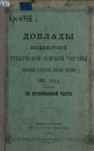 ДОКЛАДЫ В Л А Д Н М І Р С К ОЙ ГУБЕРНСКОЙ ЗЕМСКОЙ УПРАВЫ очередному губернскому земскому собранию 1901 года. ПО ВЕТЕРИНАРНО й ЧАСТИ . ВЛАДИЖІР Ъ НА КЛЯЗЬМ Ѣ . Типо-Литографія Губернской Земской Управы. 1 9 0 1.