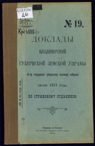 ДОКЛА № ы ВЛАДЙМІРШОЙ ГУБЕРНСКОИ ЗЕМСКОЙ УПРАВЫ о d н о д CO 18-му очередному губернскому земскому собранію СЕССІИ 1913 ГОДА. ПО СТРАХ0Б0М7 ОТДѢЛЕНІЮ. ^^ Бладиміръ на Клязьмі. Типо-литографія губернской земской. управы. 1914.