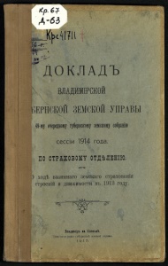 А-65 Цсрі 3 ДОКЛАДЪ ШЩЙШРСКОЙ РЕРНСЖОЙ ЗЕМСКОЙ УПРАВЫ ; 49-м| о^рерому гіірнскому земскому собранію сессіи 1914 года; ; ПО СТРАХОВОМѴ отдѣленію. р ходѣ взаимнаго земскаго страхованія строешй и движимости въ 1913 году. J^L W -w ІладЕміръ х» Кяязшѣ. Типо-лиюграфія губернской земской управы. 1© 1 5.