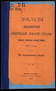 Лбз A- 63 ДОКЛАДЫ ВЛАДЙІІРСКОЙ ГУБЕРНСКОИ ЗЕМСКОИ УПРАВЫ ояередеому губернскому земскому собранію 1912 года. По пенсіонной кассѣ. ЖЖ Владиміръ на Клязьмѣ. Типо-литографія губернскои земскои управы. 1912. 1