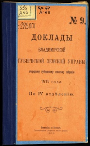 Г - Ч 355 a A-6b гЖООІ № I ДОКЛАДЫ ВЛАДЙЖРСКОЙ ГУБЕРНСКОЙ ЗЕМСКОЙ УПРАВЬ очередному губернскому земскому собранію 1915 года. По ІУ отдѣленію. ^ Бладиміръ на Клязьмѣ. Типо-литографія губернской земской управы. і 9 16.