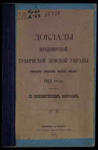 ДОКЛАДЫ ВЛАДЙІІРСКОЙ ГУБЕРНСКОЙ ЗЕМСКОЙ УПРАВЫ очередному губернскому земскому собранш 1912 года. ПО ЭШОМІПЕСШШЪ ВОПРОСАМЪ. Владиміръ на Клязьмѣ. Тиио-литографія губерискоіі земскоіі управы, 1912.