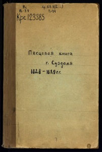 7 „Въ Суздале ж на посаде идучи отъ острожной осыпи къ спасскому монтрю большою улицею на леве мнтрь прдбные кнжны Евѳросиниі суждальскіе ружной, на^мнтрѣ црьковь каменная ризположенія пречтыя Бцьі да предѣлъ бдговѣрные кнжны Евѳросиниі Суждальские да теплая і(рковь древяны клѣтцки Знамение прчтые Бцы да предѣлъ кнзя Михаила Черниговского и болярина его Ѳешдора, ограда древяная, двои ворота святые, строёніе прежнихъ гдрей и ^рей и ннѣшняго ?ря цря и великого кнзя^ Михаила Ѳеодоровича всеа Русиі. На мнтрѣ лд кеи а в нихъ игуменья Ливѣя да 51 старица, а Денежную ругу емлютъ они изъ Большого приходу а хлѣбную изъ дворца. На той же сторонѣ тсгьжъ болшіе улицы мнтырь ружной^Живоначдныя Троицы древянъ клѣтцки да другая црьковь теплая успение Пртыя Бцы, да предѣлъ Іванна Предотечи древянъ клѣтцки, ограда древяная, ворота святые, на м^трѣ жъ кн кѣлей а в нихъ игуменья Солоникѣя да н сестръ. Мнтырьское црковное строение гдрево. Да к тому ж мнтрю на другую сторону перешедъ болшую улицу противъ святыхъ воротъ подле попова двора троецкого к пищдному ихъ пруду проходу по воду сажень, а денежную ругу емлютъ изъ Болшово приходу, а хлѣбную изъ дворцал . На той же стороиѣ улицы дворы посадскихъ людей; дворъ бобыля Гаски Ѳедорова сына прозвище Шибалковъ и др. „Въ Суздалѣ жъ на посадѣ Александровской дѣвичъ монастырь ружной; на монастырѣ церковь Александра мученика древяная вверхъ, да теплая церковь Покровъ Пресвятыя Богородицы древяна клѣтцки, церковное строеніе Государево; на монастырѣ жъ тридцать восемь келей, а въ нихъ Игуменья Ольга, да сорокъ четыре старицы; ограда