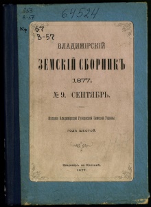 ВЛАДИМІРСКШ ;!ЕМГ.іаЙСБОРІІЙІ!]і Э.8'7'7. .N2 9. СЕНТЯБРЬ. Издаиіе Влаіиіікікі Губернской Зеюой Уіавы, голъ шестой. г ^ лѵ- <? йдадмийр-ь, иа клкаьмѣ, 18 77. 3