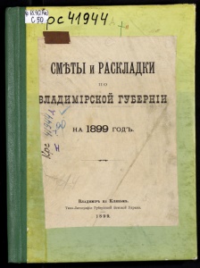 '•^'рсчтч -/I СМѢТЫ и РАСКЛАДКИ II о ПРО 1-в{) \ НА 18ѲѲ ГОДЪ. ВлАДИШРЪ НА КлЯЗЬМѢ. Типо-Литографія Губернской Земской Управы. ] 89 9.