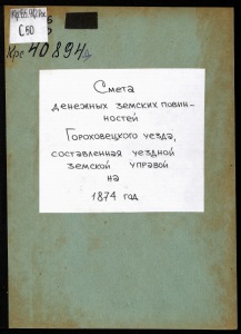 РАСКЛАДКА ОБОРОВЪ ОЪ ГОРОХОВЕЦКАГО УѢЗДА, потцебныхъ на его іѣстныя зеіскія повинности 1814 года и пцедположенныхъ уіздною зеіскою шавою, Составлена сентября 1873 года.