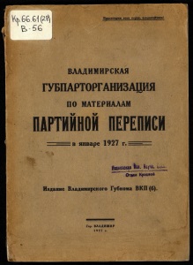 Пролетарий; всех стран, соединяйтесьі I ВМДИМИРСКАЯ 00 МАТЕРИАЛАМ S Шііво ^ в январе 1927 г. ІЯйііадая №л. Кар. Вйіі. Onen Краевѳй ИЗДАНИЕ .ВМДИМИРСКОГО ГУБКОМА ВКП (б). ..м Г. ВЛАДИМИР 19 27.