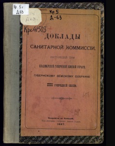 Д65 p*r^s Ш^/Л)3 ДОКЛАДЫ САНИТАРНОЙ НОММИССІИ, СОСТОЯЩЕЙ ПРИ ВЛАДИМІРСКОЙ ГУББРНСКОЙ ЗЕІСКОЙ УПРАВФ, ■ ГУБЕРНСКОМУ ЗЕМСКОМУ СОБРАНІЮ ІШ ОЧЕРЕДНОН СЕССШ. ш ^і^^^^Щ^^^Щ^ Тино-.іптоѵрафія Губернскпй Зеиской Ѵиряв 1887.