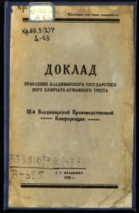 Оролетарвв всвх стран, совдщяйтесьі ДОКЛАД ПРАВЛЕНИЯ ВЛАДИМИРСКОГО ГОСУДАРСТВЕН- НОГО ХЛОПЧАТО-БУМАЖНОГО ТРЕСТА Ш-й Владимйрской Производственной ■ Конференции и * о » ( / A 0 £Т ^ ( ct 7^ ~ tv Г. Г ВЛАДИИИР. 1928 г. : 4