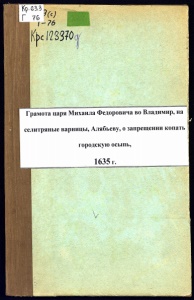 яят ' <тзш Грамота царя Михаила Федоровича во Владимир, на селитряные варницы, Алябьеву, о запрещении конать городскую осынь. 1635 г.