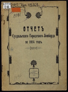 0»<г '^0 я ѵя Ѵг:- X ) 4$ І ОТЧЕТЪ Сувдалье» Городского Ломбарда за 1914 годъ. )ххѵ( СУЗДАЛЬ Тигіграфія Н. В. Козлова, 1915.