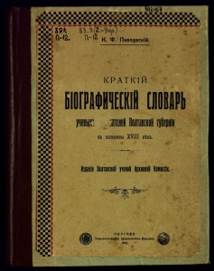 Мы далеки отъ мысли, что нашъ трудъ достаточно полонъ. Онъ принадлежитъкъ такимъ работам.ъ, гдѣ не только возможны пробѣлы, но они неизбѣжны. Всякія указанія въ этомъ отношеніи будутъ приняты архивной комиссіей съ благодарностью. Не можетъ не принести благодарности С. А. Ефремову, предоставившемудля настоящаго изданія 5 клише портретовъ писателей, А. М. Пархомовичу—1 клише, полковнику А,. Д. Ромашкевичу—3 клише, А. В. Стороженкѣ—3 клише, редакціи Науковаго Вістника—1 клише и Харьковскому Историко-филологическому Обществу—2 клише. Въ слѣдующемъ выпускѣ, мы предполагаемъпомѣстить біографіи генералъ-губернаторовъ, губернаторовъ, епархіальньіхъ архіереевъ, служившихъ въ Полтавской губерніи, а также біографіи уроженцевъ Полтавской губерніи, занимающихъ и занимавшихъ болѣе или менѣе видныя мѣста на государственнойи общественной службѣ. Въ этотъ выпускъ войдутъ благотворители и лица, въ ознаменованіи дѣятельности которыхъ учреждены стипендіи. Архивная комиссія покорнѣйше просить всѣхъ лицъ, имѣіощихъ какія либо данныя для этого выпуска, не отказать еообщеніемъ ихъ, что будетъ принято съ благодарностью. И. Ф. П.