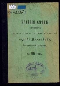 ? о 65. итп ш%ш (ПРОЕКТЪ) доходов^ъ» и реісходов^ь города ^язникобъ, Владимірской губерніи, на 1015 гсдъ. «4*-*і ^У / ВЯЗНИКИ ТИПО-ЛИТОГРАФІЯ МАТРЕНИНОКИХЪ 1914 г.