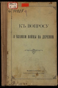 Настоящій очеркъ „Къ вопросу о вліяніи войны на деревню" составленъ на оспованіи 340 отзывовъ, -полученныхъ отъ мѣотныхъ жителей, преимущественно крѳстьянъ разныхъ селеній Владимірской губерніи Отзывы эти относятся еще къ декабрю 1904 года. Полученный матеріапъ былъ подраздѣленъ при составленіи настоящаго очерка на двѣ группы, обнимающія собой: первая —свѣдѣпія объ обезпеченіи семействъ призванныхъ на дѣйствительную службу запаспыхъ нижнихъ чиновъ и вторая —овѣдѣнія о вліяніи войны на экономическое положеніе насѳленія губерніи и на его духовную жизнь. Редакція очерка принадлежитъ П. И. Неволину.