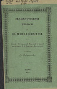 ДРЕВНОСТИ во ВЛАДИМІРЪ КЛЯЗЕМСКОМЪ. С обо ры : К аѳедральный У спен скій и бы вший п ридворнымъ В . К . В севолода — Д митріевск ій . С О Ч И Н Е НИ Е В . Д о б р о х о т о в а МОСКВА. 1849.