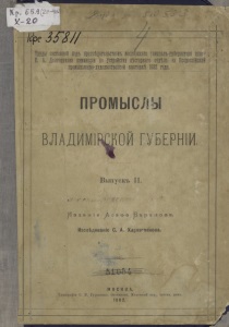 ПРОМЫСЛЫ ■ВЛАДИМІРСКОЙ ГУБЕРНІИ. Александровскій уѣздъ. И зслѣдован іе С ергѣя Х аризоменова . М О С К В А . Типографія С . В . Гурьянова. Остоженка, Молочный пер., собств. домъ.' 1882.