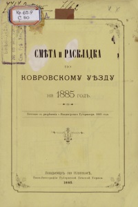 СМѢТА и РАСКЛАДКА П О КОВРОВСКОМУ УѢЗДУ на 1885 ГОДЪ. Печатано съ разрѣшенія г. Владимірскаго Губернатора, 1885 года. Владиміръ на Клязьмѣ. Типо-Лито графія Губернской Земской Управы. 1885.