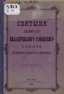 святыхъ и нетлѣнныхъ мощей—самаго строителя собора Великаго Князя Андрея Боголюбскаго и сына его Глѣба. Съ этого времени нашъ древній отечественный храмъ началъ привлекать къ себѣ усердное вниманіе не только частныхъ лицъ, но и самаго Правительства. Къ сожалѣнію усердіе нѣкоторыхъ благотворителей къ запустѣвшему соборному храму переходило границы умѣренности, и благоукрасители храма, при возстановленіи его благолѣпія, дѣлали измѣненія въ нѣкоторыхъ его частяхъ. Такъ въ 1708 году стольникъ Григорій Андреевъ Племянниковъ, возобновивъ иконостасъ и всѣ иконы въ соборѣ, пробилъ, и разширилъ въ главномъ алтарѣ окна, равно какъ и окна въ самомъ храмѣ, находящіяся надъ входами въ соборъ, и въ нѣкоторыхъ другихъ мѣстахъ. Въ 1727 году весь соборный храмъ перекрытъ былъ по желѣзнымъ стропиламъ сибирскимъ желѣзомъ, на сумму отпущенную изъ Государственной казны, но крыша при семъ, взамѣнъ кружальной, особой надъ каждымъ сводомъ, устроена шатроваяна четыре ската; при чемъ, при поднятіи ея къ среднему трибуну, находящемуся подъ позлащенною главою, наложены по всѣмъ обводамъ его, со всѣхъ четырехъ сторонъ, новыя кирпичныя накладки, а окна во всѣхъ пяти трибунахъ заложены кирпичемъ на цѣлую половину. Въ 1767 году на отпущенныя изъ казны деньги обновляемъ былъ соборъ капитально, но въ это время древній иконостасъ былъ выломанъ и вынесенъ и съ иконами, а на мѣсто его поставленъ иконостасъ новаго стиля, съ крупною золоченою рѣзьбою и съ колоннами всѣхъ орденовъ; причемъ, для протяженія во всю широту собора иконостаса, вынута была 11
