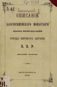 19 ніи въ 1764 году штатовъ и по упраздненіи братства, обращенъ онъ въ приходскую, образовавшагося изъ монастырскихъ слободъ города Киржача, церковь. Узнавъ объ основаніи преподобнымъ Сергіемъ Благовѣщенскаго монастыря и отчасти коснувшись упраздненія его, перейдемъ къ описанію церквей, находящихся нынѣ въ стѣнахъ ограды монастырской, которая живо напоминаетъ, что тутъ нѣкогда находилась обитель смиреннаго братства. III. ОБОЗРѢНІЕ ХРАМОВЪ ГОРОДА КИРЖАЧА ВЪ НАСТОЯЩЕЕ ВРЕМЯ. Не находя древнихъ монастырскихъ описей церковнаго имущества, мы не имѣемъ посему средствъ показать различіе,—настоящаго съ прошедшими вѣ2*