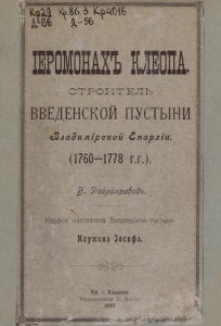 ВладимірскойЕпархіи (1760-1778 г.г.). В . Д о6ронравовъ. ИЗДАНІЕ НАСТОЯТЕЛЯ ВВЕДЕНСКОЙ ПУСТЫНИ ИГУМЕНА Іосифа. Губ. г. Владиміръ. Скоропечатня И. Коиль. 1908. ІЕРОМОНАХЪКЛЕОПА, СТРОИТЕЛЬ ВВЕДЕНСКОЙ ПУТСЫИН
