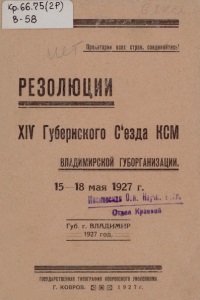 Пролетарии всех стран, соединяйтесь! XIV Губренксого Съезда КСМ ВЛАДИМИРСКОЙ ГУБОРГАНИ8ДЦИИ. 15—18 мая 1927 г. Губ. г. ВЛАДИМИР 1927 год. ГОСУДАРСТВЕННАЯ ТИПОГРАФИЯ К0ВР0ВСК0Г0 УИСПОМОМА Г. КОВРОВ. 1 9 2 7 г.