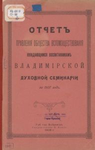 ОТЧЕТЪ ПРАВЛЕНІ Я ОБЩЕСТВА ВСПОМОЩЕСТВОВАНИЯ НУЖДАЮЩИМСЯ ВОСПИТАННИКАМ ВЛАДИМІРСКОЙ ДУХОВНОЙ СЕМИНАРИИ за 1907годъ. Г уб. гор. Вадід и м і р ъ. Скоропечатня И. Коиль. 1908 г.