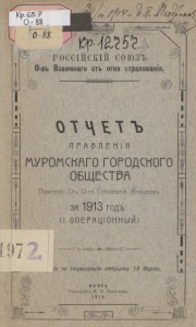 россійскій союзъ О-въ Взаимнаго отъ огня страхованія. от чет Ъ правлен і я муРомскаго городского ОБЩЕСТВа Взаимнаго Отъ Огня Страхованія Имуществъ за 1913 годъ (і. опЕРацюнный) і/' н по страхованію открыты 19 Марта. ВЫКСА, Типографія И. И. Капустина, 1914.