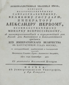 ЛЮБОПРАЗДНСТВЕННАЯ ХВАЛЕБНАЯ ПѢСНЬ, К О Т О рую БЛАГОЧЕСТИВ ѢЙ Ш ЕМ У САМОДЕРЖАВН Ѣ ЙШ Е М У , ВЕЛИКОМУ ГОСУДАРЮ, ИМПЕРАТОРУ АЛЕКСАНДРУ ПЕРВОМУ, В СЕМИЛОСТИВѢЙШЕМу МОНАРХУ ВСЕРОССIЙСКОМУ, вЪ высокоторжественнѣйшій и всерадостнѣншій для РоссовЪ день Высочайшаго и Благодатнѣйшаго прибытія ЕГО ИМПЕРАТОРСКАГО ВЕЛИЧЕСТВА ВЪ ЦАРСТВУЮЩІЙ ГРАДЪ МОСКВу, со всеподданнѣйшимъ привѣтствіемъ и благодареніемЪ п о е тЪ Московская Славяно-Греко-Латинская Академія, 1801 г ода Сентября дня. СЪ дозволені я Московской Цензуры. М О С К В А , ВЪ университетской Типографіи, у Xр. Клаудія .