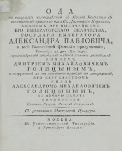 ~77Г"' ' 'Ч к •' ■ 1 ■J =rfУ • Д * .*£-Іj ,_Д О Д А на открытіе великолѣпной вЪ Москвѣ Больницы сЪ освященіем Ъ храмаво имя Св. Димитрія БЫВШЕМЪ ПРИ ВЫСОЧАЙШЕМЪ ЕГО ИМПЕРАТОРСКАГО ВЕЛИЧЕСТВА, ГОСУДАРЯ ИМПЕРАТОРА АЛЕКСАНДРА ПАВЛОВИЧА, и всей Высочайшей фамилія присутствіи, Сентября 22 дня 1801 года; преднамѣренной п окойнымъ и вѣчной памяти достойнымъ К Н Я З Е М Ъ Д МИТ РIЕМЪ МИХАЙЛОВ ИЧЕМЪ ГОЛИЦ Ы Н Ы М Ъ, а сооруженной по его завѣщанію БратомЪ его двоюроднымЪ, ЕГО СІЯТЕЛЬСТВОМЪ К Н Я З Ь АЛЕКСАНДРОМЪ МИХАЙЛОВИЧЕМЪ ГОЛИЦ Ы Н Ы М Ъ , въ вѣчную ПАМЯТЬ сочиненая Провинц. Секрет. ИваномЪ Т одорскимЪ. СЪ дозволенія Московской Цензуры. MOCKВ АВЪ университетской Типографіи. у Христофора Клаудія. ѵ
