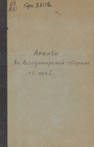 АРХИВЫ во Владимірской губерніи. (Описаніе архивовъ и содержаніе нѣкоторыхъ изъ нихъ). Томъ I, ВЫП. I. Изданіе Владимірской Ученой Архивной Коммиссіи. ВЛАДИМІРЪ на КЛЯЗЬМѢ. Типографія Губернскаго Правленія. 1916.