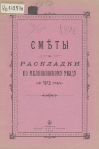 с м ѣ т ы Р А С К Л А Д К И ПО МЕЛЕНКОВСКОМУ УѢЗДУ на 1913 годъ. г. Меленни, Типографія вр. Ив. и А. Власовыхъ. 19 13. И