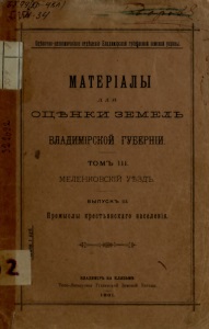 * Г ч 4 ч Рдѣнсчво-зкодомическоБ отдѣленіе Владидірской губврнсвой зеискрй удравы. МАТЕРІАЛЫ л л я ОЦЪНІСИ ЗЕМЕЦЕЪ • ѵ ВЛАДЙМІСРКОЙ ГУВЕРЙШ. ТОМЪ III. МЕЛЕНКОВСКІЙ УѢЗДЪ. ВЫПУСКЪ III. Промыслы крестьянскаго населенія.' 4 Г " МЁЛЕНІСОІІСКАЯ [ центрввмзовэииая ВЛАДНМІРЪ НА КЛЯЗЬМѢ. Типо-Литографія Губернской Земской Управы. 1901.