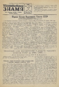 Пролетарии всех стран, соединяйтесь!,, Большевистское ЗНАМЯ Орган Пот ушинсног о РК В К(Пб ) н Р а й вс оеат депутатов трдуящихся итшипп. год ____ 1ЦММ_____ № 18-19(1825) СРЕДА 20 МАРТА 1946 г ВЫХОДИТ 1 Раз В НЕДЕЛЮ цена 10 коп 15 марта на Сессии Верховного Совета СССР был заслушан доклад о пятилетием плане восстановления и развития народного хозяйства СССР на 1946-1950 годы, Новая пятилетка воплощает гениальную сталинскую программу дальнейшего укрепления могущества нашей Родины. Первая Сессия Верховного Совета СССР ШШоШ Щ йонно ё сообщени о совместном заседании Совета Союза и Совета Национальностей 15 марта 1946 года 15 марта, в 7 часов вечера, в Кремле, в Большом Кремлевском Дворце состоялось совместное заседание Совета Союза и Совета Национальностей. Председательствующий— Председатель Совета Союза депутат А. А. Жданов предоставляет слово для доклада о пятилетием плане восстановления и раз- шле я народного хозяйства С ® Р на 1946—1950 г. г. Председателю Госплана СССР депутату Вознесенскому Н. А. ПосЙе доклада депутата Вознесенского председательствующий сообщает, что согласно установленному Верховным Советом порядку обсуждение доклада о пятилетием плане и принятие закона будут прово-’ диться на раздельных заседаниях Совета Союза и Совета Национальностей. | Верховный Совет СССР, переходит далее к раесмот-1 рению пункта 5 порядка; дня—образование Правительства СССР — Совета Народных Комиссаров СССР. Председательствую щ и й оглашает заявление Председателя Совета Народных Комиссаров СССР депутата Н. В. Сталина. > ] «Председателю совмест- | ного заседания Совета Со- [юза и Совета Националь- [ностей Верховного Совета | СССР тов. Жданову А. А. I В связи с тем, что вопрос об образовании Правительства СССР поставлен на ра,‘.смотрение Верховного Совета СССР, Совет Народных Комиссаров считает свои обязанности исчерпанными и слагает свои полномочия перед Верховным Советом. Совет Народных Комиссаров СССР просит Вас довести о настоящем до сведения Верховного Совета Союза Советских Социалистических Республик. Председатель Совета Народных Комиссаров СССР И. Сталин 15 марта 1946 года». По предложению депутата Гречухи М. С. Верховный Совет СССР единогласно принимает следующее постановление: «Верховный Совет Союза Советских Социалистических Республик принимает заявление Председателя Совета Народных Комиссаров СССР о сложении Правительством СССР своих полномочий перед Верховным Советом СССР и поручает Председателю Совета Народных Комисзаров Союза Советских Социалистических Р е с пу б л и к товарищу Сталину Иоеисру Виосарионовичу представить Верховному Совету предложения о составе Правительства СССР». В связи с обсуждением вопроса об образовании Правительства СССР депутат Шверник Н. М. вносит на рассмотрение Верховного Совета предложение о преобразовании Совета Народных Комиссаров СССР в Совет Министров СССР и Совет Народных Комиссаров союзных и автономных республик — в Советы Министров союзных в автономных республик. Верховные! Совет СССР раздельным голосованием по палатам по статейно и в целом единогласно постановляет: «1. Преобразовать Совет Народных Комиссаров СССР в Совет Министров СССР и Народные Комиссариаты СССР — в Министерства СССР. В соответствии с этим впредь именовать Председателя Совета Народных Комиссаров СССР Председателем Совета М