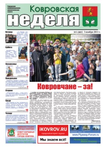Пятница страница 8 страница 16 Суббота Воскресенье страница 11 страница 2 Понедельник Вторник страница 3 страница 13 Среда страница 13 Четверг №5 (005) 3 ноября 2011 г. Городская информационноаналитическая газета В Коврове появился новый троллейбусный маршрут № 9. И это результат усилий местной власти и социальной политики проводимой ОАО «КМЗ» (Топливная компания Росатома «ТВЭЛ») Для Коврова он был человеком-легендой. Основателю Народного театра «Поиск» Виктору Ершову 12 ноября исполнилось бы 70 лет. Статья «Персидская сирень» – к юбилею замечательного режиссера и человека. Обездоленные дети – позор взрослых. Насколько адекватна помощь государства маленьким горемыкам? Подумаем вместе… Волейболисты команды «Вымпел», став сильнейшими в области, впервые завоевали право на участие в Чемпионате России. Наведение порядка в городе и обеспечение нормальной жизнедеятельности, планы реконструкции и подготовка к праздникам. В администрации состоялась ежемесячная планерка с представителями федеральных структур. Накануне очередной годовщины Октябрьской революции главное напоминание об этом событии в Коврове – памятники ее вождю, Ульянову-Ленину. Какова их судьба и сколько таких монументов осталось в нашем городе. Об умопомрачительной красоте «интересного положения». Будущие мамочки, смелее! Пожалуйте на конкурс красоты! 1 ноября на площади Победы закончилась акция по сбору подписей в поддержку присвоения Коврову звания «Город воинской славы». 2 недели активисты «Молодой гвардии» собирали их на улицах города. Напомним, что идея выдвинуть наш город в кандидаты на столь высокое звание принадлежит пенсионеру-инвалиду, бывшему рабочему ОАО «ЗиД» Александру Зыкову. Именно он, будучи знатоком истории завода и города, несколько лет вынашивал эту идею. В 2009 году Зыков обращался к Ирине Табацковой и Людмиле Петровой с предложением подготовить материалы для подачи заявки. Однако у тогдашней главы и у председателя горсовета его устремления не вызвали энтузиазма. Тогда Зыков пришел в редакцию газеты «Ковровские вести». В публикации идея идея обрела реальные очертания и логическую завершенность. Предложение получило массу положительных откликов и журналисты обратились за помощью к единороссам. Основным «двигателем» идеи Ковровчане – за! стал Виктор Кауров. Еще будучи депутатом ЗС области, он начал активную работу по сбору документов на заявку. Противники нынешней городской власти называют данную инициативу идеей-фикс, которая не имеет шансов на реализацию. Однако и депутаты городского Совета, и горадминистрация, и большинство жителей Коврова поддерживают мнение Александра Зыкова и, так же как он, считают наш город достойным звания «Город воинской славы». – К нам часто подходили пожилые люди и просили дать чистые подписные листы, чтобы помочь быстрее собрать подписи – рассказывают «молодогвардейцы». – Один кововский предприниматель пригласил нас в свое кафе, угостил ужином. А сам обошел всех посетителей и собрал 30 подписей. Много добрых слов мы слышали в поддержку почетного статуса нашего города! Эти слова подтверждены документально. Собрано 49223 подписи! С площади Победы подписные листы перевезли в администрацию, где активист Общероссийского Народного Фронта Л. Романова передала главе города В. Каурову это яркое и однозначное вол