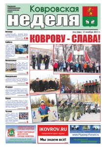 11 ноября 2011 г. №6 2 А что нам это даст? Такой вопрос задают те, кто считает себя деловым человеком, кому некогда витать в облаках, кто полагает, что избавился от юношеских иллюзий. А что вы хотите? Чтобы всем ковровчанам выдали из федерального бюджета тыщ по тридцать рублёв? Так Главный федеральный инспектор И. Князев зачитывает Указ Президента Красивое имя – высокая честь 3 ноября Указом Президента России Коврову было присвоено почетное звание Российской Федерации «Город воинской славы». Эту новость на следующий день, во время празднования Дня народного единства, объявил Главный федеральный инспектор по Владимирской области Игорь Князев. Теперь 4 ноября для ковровчан двойной праздник. После поздравлений в адрес горожан от депутатов Государственной Думы и Законодательного Собрания области состоялось возложение цветов к монументу воинам, павшим в годы Великой Отечественной войны. Троекратный залп из стрелкового оружия завершил торжественную часть церемонии. Пять колонн по семь машин в каждой, в сопровождении инспекторов ГИБДД отправились по главным улицам города, чтобы через громкоговорители зачитать исторический для Коврова указ. заслуги-то, вроде, не ваши, при чем тут вы? Виктор Кауров по этому поводу сказал: «Тому, кто задает этот вопрос, ничего это звание не даст. Он как жил, так и будет продолжать жить». Откуда у потомков это торгашеское отношение к чести и славе предков? Почему вопрос о выгоде задают те, кто сами ничего не сделали для своего города? И почему мой брат, награжденный медалью «За отвагу», его не задал? Надличностные ценности не имеют материальной составляющей, но именно поэтому ценны сами по себе. Великие дела свершались и свершаются только благодаря им. Кто не признает этих «эфемерных» идей, тот не сможет гордиться Ковровом, для него в жизни ничего не изменится. Ну, появится памятная стела с изображением герба города и текстом Указа Президента, ну, с четырех сторон площадь украсят барельефы с изображением наиболее значимых событий, которые послужили причиной присвоения почетного звания, ну, трижды в год будет звучать салют. И чего? Да ничего. Стела – это не награда, а увековечение подвига ковровчан, салют – не подарок, а дань уважения героям. Впрочем, рассчитывать Коврову, как муниципальному образованию, на более пристальное внимание властей все-таки можно. К примеру, в нынешнем году из федерального бюджета было выделено 650 млн. рублей на ремонт и содержание улиц городов воинской славы. Войти в федеральные программы тоже будет несколько проще, не абы какой город. На данный момент Ковров – самый успешный в плане отчислений в федеральный и областной бюджеты. Но получает средств меньше всех муниципальных образований области. Эту несправедливость тоже легче будет исправить. Как говорится, поживем – увидим. Но хуже-то точно не станет. Однако так считают не все. Местную «оппозицию» не хочется даже упоминать, ее представители потеряли чувство реальности и давно перепутали, где черное, а где белое. Но что же губернатор? К примеру, на неоднократные обращения в адрес губернатора с просьбой поддержать ходатайство о присвоении Коврову почетного звания РФ горадминистрация получала отказ. «15 августа 2011 года, – вспоминает Виктор Кауров, – председатель комитета государственной и муниципальной службы Валерий Сипатов н