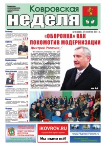 №8 (008) 25 ноября 2011 г. Городская информационноаналитическая газета Пятница страницы: 1, 2, 4 страница 3 Суббота Воскресенье страница 16 страница 20 Понедельник Вторник страница 4 страница 5 Среда страница 6 Четверг Будущее оборонной отрасли решается в Коврове. Тема и итоги совещания на заводе имени Дегтярева в материале «Оборонка» как локомотив модернизации». Пешеходы бывают двух видов… Как взаимное непонимание приводит к трагедии на дороге. Елена Крыжко в составе ковровской делегации побывала во Владимире на Форуме матерей Центрального федерального округа. О многодетной матери в материале «Когда женщина – солнышко». «Бюджет сохранит социальную направленность», – так утверждает зам. председателя Совета народных депутатов В.Б. Кузнецов. Интервью с ним в рубрике «От первого лица». «Любите спорт», – советует легенда мотоспорта, мастер спорта СССР по мотоболу Виталий Рогожин. Он планирует в феврале принять участие в традиционных зимних заездах. «Лебедушка» в Париже. Ковровский коллектив театра моды принял участие в фестивале «Русское искусство в городах Европы». Европейцы были восхищены красотой русского народного костюма. 25 ноября – 80 лет Дому детского творчества. «Продолжение следует» – о славной истории ковровского Дома пионеров. – Мы собрались в Коврове, это – одна из столиц российской «оборонки», на заводе, у которого есть не только история, но есть и будущее… Важно, чтобы общество знало об усилиях, предпринимающихся сейчас для выхода из того глубокого пике, в котором «оборонка» и в целом вся наша промышленность находились с 90-х годов. Сейчас для этого есть все: и необходимые ресурсы, и политическая воля. Главное – отработать слаженность власти, промышленников и военных. И важно приложить максимум усилий для того, чтобы страна видела свое будущее не только на пять, а на двадцать, тридцать и сорок лет вперед. Чтобы мы понимали, в каком мире будем жить и как сделать этот мир безопасным и комфортным. Этому посвящено сегодняшнее, беспрецедентное по своему составу, мероприятие. И оно, конечно, будет иметь продолжение уже в других аудиториях… Чтобы армия получила высококачественное оружие, а предприятия получили столь необходимые им заказы. Чтоб оборонная промышленность, как и раньше, выступила «локомотивом» российской индустрии. Дмитрий Рогозин: стр. 2,4 «ОБОРОНКА» КАК ЛОКОМОТИВ МОДЕРНИЗАЦИИ