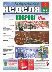 №13 (013) 30 декабря 2011 г. Городская информационноаналитическая газета Пятница страницы 2–3 страницы 10–11 страницы 3–5 страница 12 страница 4 страница 17 Суббота Воскресенье Понедельник Вторник Среда Четверг страница 4 страница 10 достоин КОВРОВ! с н и я е зК ц ч а а нд н о у а м , м ш ы с к р е и й у о ж к в о с е г н е р е у ео б с щ м о п н л е е л ь о ж ши й д о р у п й а т о д , д с мо р в с н о у т ж е о и г г и о и з т а е в ь о т с п р п я л и л . а о К н мщ о ы е - е - - нсе втиоеяи. имОн итт ерз рав едо сннноку, а юмч тиио, нс вфо ыво ер птмоа амдцдиие, юрп ж. р Оои чсв ьеа бне аьт мениан, дад еса - - есд омо вбс мяь еенмс атс нят ыоз , нмчаитчоиувмс иын лах ис ртяеумзпиуал! юь т—ща ет моо вбг . оя дз ау т ме лыь —н о л иДСв оыНро, озвгдыиомер онг воаыдшо, иму !с! пС е ншанс ыт у! пПауюс тщьивма м2 0с о1 п2 у- мт с! тБвуудеьтт уе д саччаас. т - Коллектив редакции газеты «Ковровская неделя» Ты 2012 С Новым годом! Óâàæàåìûå ÷èòàòåëè! славы! Гордость Коврова. Состоялась церемония «Человек года». Нетрезвая оппозиция жаждет справедливости! Эксклюзивный календарь от «Кововской недели». Администрация Коврова поддерживает бизнес. Успехи есть! Подружимся с Драконом? Все о наступающем годе! Провокация в яркожелтом стиле. Опять двойные платежки… Первомайский рынок обещает веселые каникулы на новом катке!