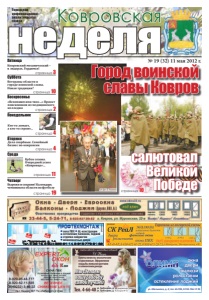 Ковровская неделя Городская информационно- аналитическая газета страница 19 Понедельник страница 2 Вторник страница 4 № 19 (32) 11 мая 2012 г. Пятница Воскресенье страница 4 Суббота страница 3 страница 10 Среда Четверг страница 11 реклама страница 10 окна двери жалюзи рольставни остекление лоджий ул. Абельмана, д. 4; тел. 65-993, 8-915-766-17-95 реклама реклама ПРОФТЕХМОНТАЖ реклама l окна ПВХ l AL-конструкции l остекление балконов, лоджий l отделка сайдингом l межкомнатные двери ул. Подлесная, д. 14. Тел. 5-32-19, 8-904-955-81-14, 8-915-776-81-82 от 13000 от 12300 от 9500 Букеты невесты классические и креативные. Оформление свадьбы живыми цветами и элементами декора Тел. 4-66-40 Мы сделаем вашу свадьбу самой лучшей ул. Грибоедова, д. 50 (напротив кафе «Диалог»); ул. Грибоедова, д. 1 («Ассорти» № 13) реклама студия цветов и креативных подарков Город воинской славы Ковров салютовал Великой Победе Все фото Б. Никитина Вырежи и сохрани! Календарь чемпионата области по футболу Ковровский механический – в лидерах. Гордимся! Ветераны области в городе воинской славы. Новая традиция? «Вспомним имя твое…» Проект поисковиков из медицинского колледжа Кто-то ломает, а кто-то строит… Дела скорбные. Семейный бизнес по-ковровски Кубок сезона. Очередной успех «Ковровца»…