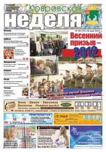 Ковровская неделя Городская информационноаналитическая газета страница 14 Понедельник страницы 12-13 Вторник страница 3 № 20 (33) 18 мая 2012 г. Пятница Суббота страница 2 Воскресенье страница 12 страница 3 Среда Четверг страница 4 реклама страница 3 окна двери жалюзи рольставни остекление лоджий ул. Абельмана, д. 4; тел. 65-993, 8-915-766-17-95 реклама реклама ÏÐÎÔÒÅÕÌÎÍÒÀÆ реклама окна ПВХ AL-конструкции остекление балконов, лоджий отделка сайдингом межкомнатные двери Òåë. 5-32-19, 6-68-38, 8-904-955-81-14, 8-915-776-81-82 от 13000 от 12300 от 9500 Букеты невесты классические и креативные. Оформление свадьбы живыми цветами и элементами декора Тел. 4-66-40 Мы сделаем вашу свадьбу самой лучшей ул. Грибоедова, д. 50 (напротив кафе «Диалог»); ул. Грибоедова, д. 1 («Ассорти» № 13) реклама Весенний призыв – Íåò, íå óøëè ãåðîåâ âðåìåíà! È ïîäâèãîâ áûëûõ îñòàëàñü ñëàâà... 2012 Все фото Б. Никитина Кубок Князя Владимира в Коврове! Все о спорте Квартирный зуд оппозиции. Старые песни не о главном… Многомерный Миронов – Человек, Публицист, Художник Таланты и поклонники. Ковров творчеством богат В бой идут одни… мертвяки. Политические Выборы по-новому. Что день грядущий нам готовит? Субсидии вам в помощь! Продолжаем расчет