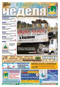 3 № 41 Ковровская неделя 12 октября 2012 г. АктуАльнАя информАция темы недели На «шестерке» все теплее Продолжается капитальный ремонт теплотрассы первого контура по «шестерке». Из городского бюджета на эти цели выделили 9 млн. рублей. Кроме того, запустят и новую теплотрассу, которая была капитально отремонтирована еще пять лет назад! Все это время из-за плохого состояния первого контура трубы просто лежали в земле. Глава заверил, что после окончания работ на первом контуре уйдет в прошлое проблема холодных батарей в домах на ул. Муромской, Колхозной и Сосновой. Жителям ул. Ранжева повезло меньше – капитальный ремонт сетей, по которым тепло и горячая вода подается на эту улицу, планируется в следующем году. В этом денег в бюджете хватило лишь на текущий ремонт.Активно ведутся и работы по строительству ливневой канализации на ул. Муромской. Глава города сообщил журналистам на пресс-конференции, что строить ливневки продолжат и в будущем году. А где еще 12? В октябре асфальтировку продолжат. Ремонтируют ул. Дегтярева, в ближайших планах – ул. Правды, Першутова и Заречная Слободка. Если позволит погода, отремонтируют ул. Любецкую. Таким образом, освоят все средства, выделенные из областного дорожного фонда. В. Кауров выразил надежду, что удастся решить вопрос с 12 млн. рублей, которые так и не пришли в Ковров.В следующем году продолжатся работы по строительству ул.Тургенева и Маршала Устинова, а также начнутся работы по строительству транзитной объездной дороги доИванова. Бюджет с плюсом Среди положительных итогов сентября – профицит городского бюджета по итогам 9 месяцев. Прибыль потратят на строительство физкультурно-оздоровительного комплекса и стадиона в спорткомплексе «Звезда». Глава заверил, что к 30 октября обновленное поле будет полностью готово. В ходе пресс-конференции глава затронул еще одну тему, активно обсуждаемую в городе. Речь – об установке монитора на памятном знаке «200 лет Коврову». В. Кауров подтвердил, что, действительно, монитор будет установлен.Более года назад был объявлен конкурс на размещение монитора для трансляции социальной рекламы, объявлений служб ГО и ЧС, а также новостей. Конкурс выиграла одна из ковровских фирм, а в процессе подготовки выяснилось, что конструкции памятника надо укреплять. Так что монитор, помимо своей прямой функции, послужит еще и укреплением всей конструкции. Памяти патриотов 16 октября в 15.00 в Доме детского творчества состоится региональный фестиваль патриотической песни. Вход свободный. Песни исполняют наши земляки-ветераны и гости фестиваля: И. Березовская, В. Буров, О. Бухтоярова, А. Вишняков, Р. Гайнуллин, В. Грицкевич, П. Калыгин, А. Каменцев, Г. Курышев, Д. Маштаков, М. Сафронова, Н. Смирнов, К. Сугак, Д. Федоров, А. Швецов, группа «Талисман» и другие. В программе показательные выступления клуба исторической реконструкции «Врата свободы», театра моды «Лебедушка». Перед началом фестиваля в фойе играет духовой оркестр, работает выставка «Ратная слава», фото и сувениры на память. Принимаются добровольные взносы на изготовление мемориальных досок Сергею Болотову, погибшему в Афганистане, и Владимиру Спирину, погибшему в Чечне. Прямая линия Ольга Шипунова Звонков с вопросами главному врачу центральной городской больницы андрею Полтыреву во время проведения прямой линии было много. д